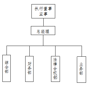 公司组织架构(见下图),内设综合部、财务部、法律合规部和业务部。