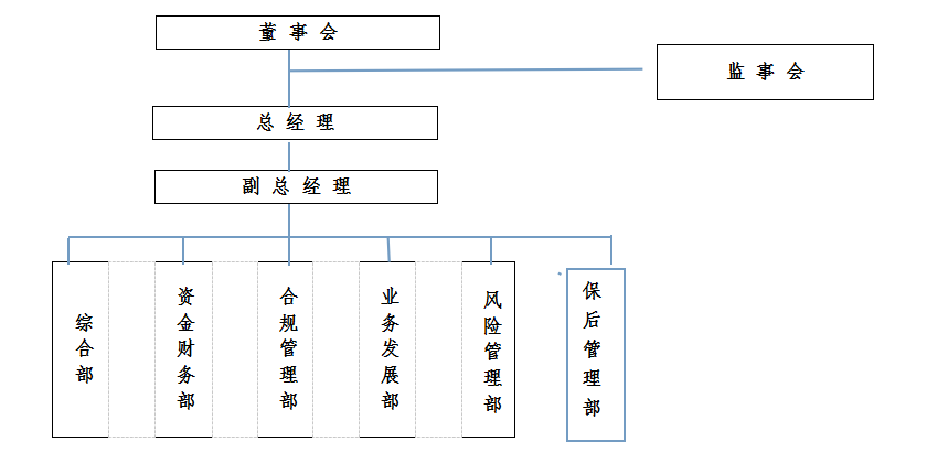公司组织架构(见下图),内设业务发展部、风险管理部、保后管理部、合规管理部、资金财务部和综合部。