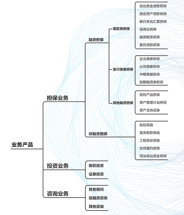 流动资金贷款担保、固定资产贷款担保、银行承兑汇票担保、信用证担保、融资租赁担保、委托贷款担保等。